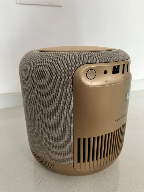 在外观方面,这款投影仪还是比较独特的,别具一格的设计也能让人一眼就将其与投影仪测评中的其他款式区分开来,在外观的细节方面它也是质感满满,机身的顶盖还采用了时下流行的触控感应按键,四个独立的按键有着不同的功能,轻轻触碰还可以唤起这款投影仪的音乐模式,从这一点上就可以看得出来这款投影仪,已经并不满足于“只是一个投影仪”的定位了。