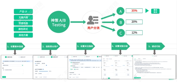 A/B Testing 支持产品 UI、文案内容、页面布局、颜色样式等多类产品方法的用户流量分组测试,支持实时查看效果,全阶段用户转化评估,实现多维深度评估 A/B 用户后续转化效果追踪,能有效减少线上全用户的事故并提升产品迭代效率。