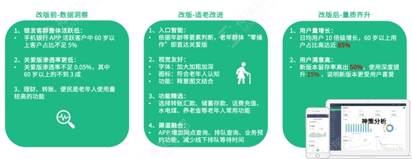 第二,老年版用户体验分析,通过对关爱版数据洞察提出相应改版建议,提升核心用户量,核心用户占比从 5% 提升至 85%,产品粘性留存率提升 50%,使用深度提升 15%。