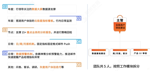 通过该项目,行方解决了原本无法量化的用户体验问题,从 0 到 1 依托用户体验体系建设、产品基础优化建设等多方案,实现行内用户旅程数据的可用性改造,最终在行内落地沉淀了一套用户体验指标体系、上线了一套指标管理、落地了分析优化迭代机制,为后续的数据业务侧深度应用打下扎实基础。