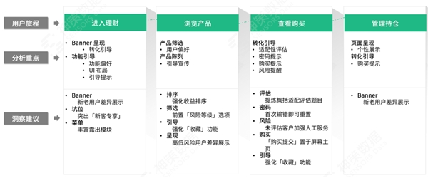 第一,理财产品场景分析,通过梳理理财场景下的用户旅程,从流量分发、产品流程转化、用户画像等多方面进行分析。洞察理财场景的用户体验问题,通过优化迭代,产品转化率提升了 15%。