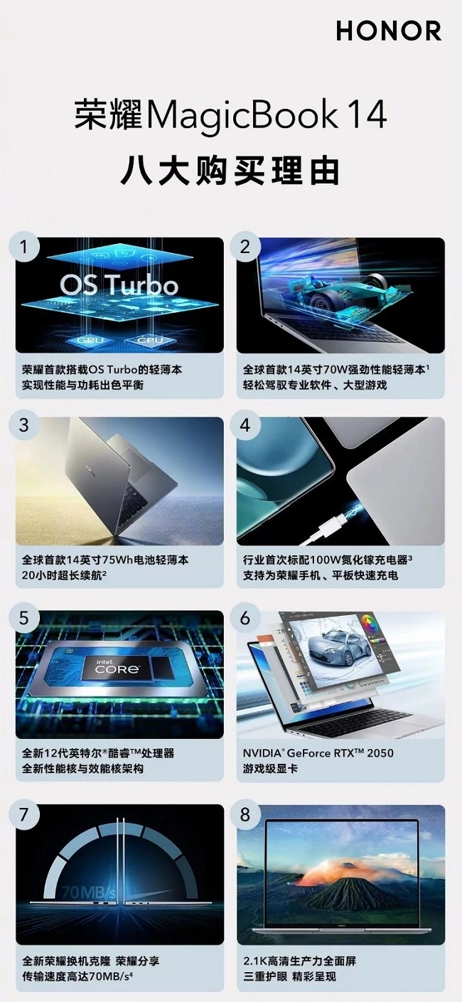 全新荣耀MagicBook 14正式开售!这是荣耀首款搭载OS Turbo的轻薄本,70W满血性能,20小时超长续航,性能时刻在线。全系搭载第12代智能英特尔®酷睿™ 标压处理器,最高搭载NVDIA® GeForce RTXTM 2050光追独显,是全球首款14英寸70W强劲性能轻薄本,也是全球首款14英寸搭载75Wh超大容量电池的轻薄本。全新荣耀MagicBook 14 售价5499元起,首销优惠价4999元起,荣耀商城、各大授权电商、荣耀体验店、授权零售门店现已开售。