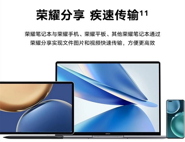 全新荣耀MagicBook 14互联能力再升级。换机克隆支持多品牌电脑向荣耀笔记本进行数据迁移,传输速度高达70MB/s;荣耀分享支持荣耀电脑-手机-平板之间多设备一键互传,轻松、高效、便捷、迅速。