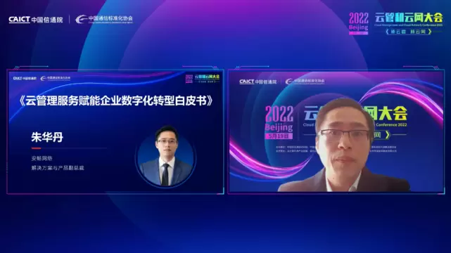 会上,中国信通院与安畅网络联合发布了《云管理服务赋能企业数字化转型白皮书》,安畅网络解决方案与产品副总裁朱华丹对白皮书发布进行介绍。