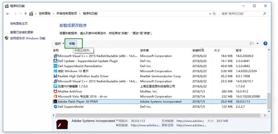 首先需要卸载电脑中原有的旧版本Flash Player。在电脑菜单栏输入“控制面板”,打开进入,在“控制面板”页面中找到“程序和功能”。“程序和功能”窗口中显示的是该电脑中安装的所有应用程序,找到并单击Flash Player,点击窗口右上方的“卸载”按钮,按照弹窗的提示进行操作即可。