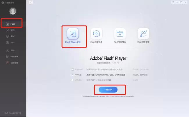 Flash中心下载完成后,选择右边菜单栏中的“Flash Player安装”,Flash中心将对下载版本进行提示。此外,也可通过“一键安装”进行多个Flash系统版本的安装,不同系统版本之间互不影响。更新完成后重启需要调用Flash的软件,即可解决Flash的无法正常运行的问题。