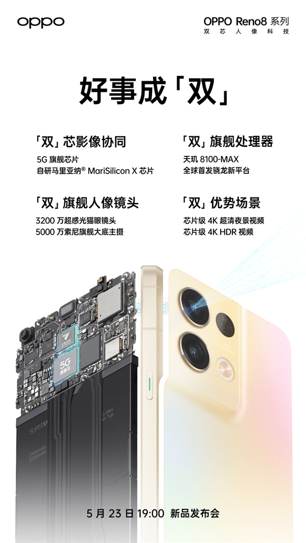 OPPO Reno8系列通过天玑8100-MAX+全球首发的骁龙新平台「双」旗舰芯,协同自研马里亚纳® MariSilicon X芯片,共同构建「双」芯影像系统,带来「双」优势场景,还搭载了「双」旗舰人像镜头以及续航「双」保险,在影像、性能以及续航方面都实现了好事成“双”,将具备更强大的综合实力和出色体验。如果想要了解更多OPPO Reno8系列新品信息,敬请期待5月23日19:00(周一)的新品发布会,届时可前往OPPO官网进行观看。
