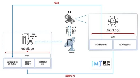 KubeEdge和昇思MindSpore主要用于建立地面和卫星之间的多模型协作推理,以及地面增量模型训练,便于在卫星上使用小模型,在地面数据中心进行训练并使用全局模型。当模型遇到困难样本时,卫星会压缩样本发送到地面,在地面中心使用昇思MindSpore执行增量学习任务,提高模型精度,地面中心将模型局部更新并压缩后上传至卫星,卫星上通过Mindspore进行模型的解压和更新,使卫星即可使用最新的模型持续开展包括森林火情检测、大地遥感等业务。