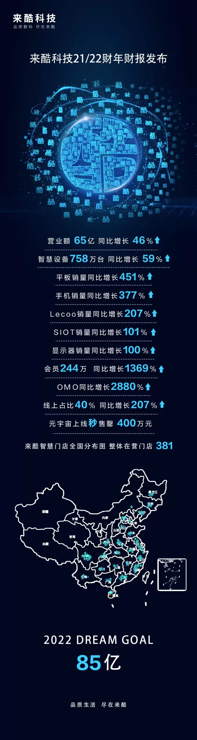 不久前,来酷科技发布了2021/2022财年的财报数据,报告显示,在疫情以及行业竞争加大等一系列不利因素影响下,来酷科技依然取得了理想的业绩,2021年全年营业额实现65亿,同比增长46%,智慧设备销售达到了758万台,同比增长59%,OMO同比增长2880%,会员数量同比增长1369%。
