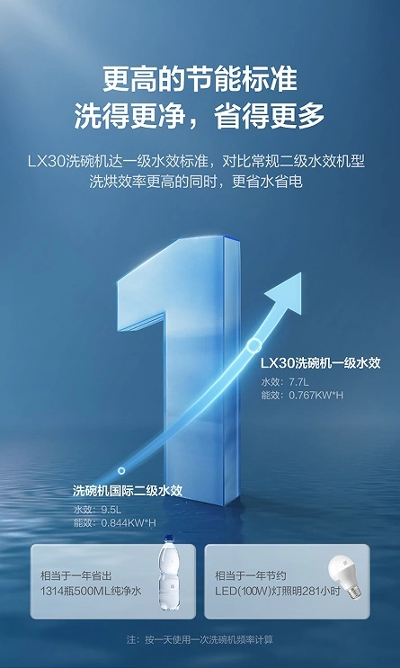 对于用户来说,洗碗机能效等级越高,意味着更加节能环保。通常洗碗机达到一级水效标准,不仅代表着节水节电指数,还代表着洗净和烘干能力更强劲,而洗碗机优于一级水效,碗碟清洁会更洁净,也更节能省钱。