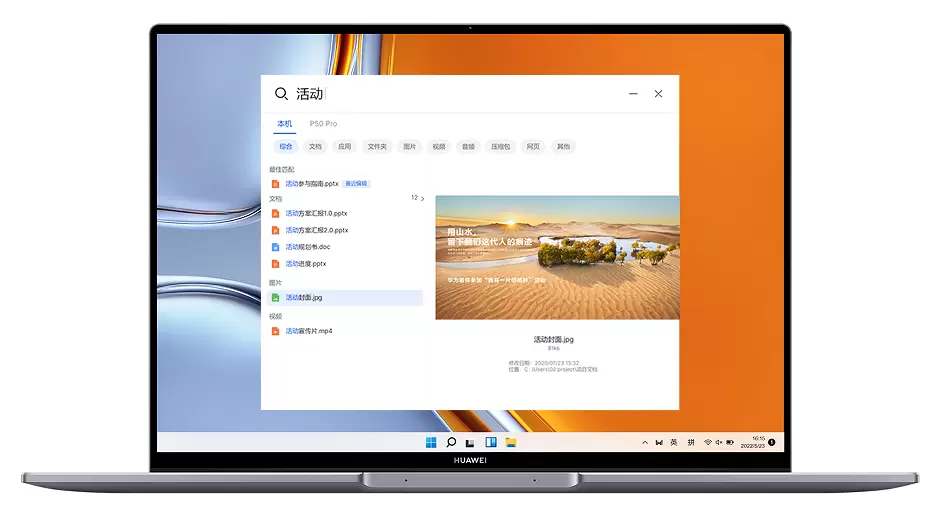 除此之外,华为智慧搜索还集“本地搜索+网页搜索+跨端全局搜索”于一身,支持连接状态下搜索PC、手机多设备文档、图片、视频等内容,强劲搜索力,用户可快速精准地找到目标信息,无需多次重复搜索,真正做到手机文件电脑找;此外,一站式定位功能,不仅可以快速检索到目标对象,还能展示文档、图片、在线网页等多类型搜索结果,轻轻点击,即刻预览文件内容详情,无需等待跳转,高效办公一键开启。
