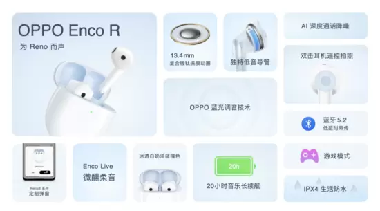 全新的OPPOEncoR真无线耳机,产品名取自Reno的R,代表为Reno手机用户提供具有定制化体验的真无线耳机。OPPOEncoR外观延续Reno对色彩的探索,结合冰透白和奶油蓝两种颜色,呈现如同冰川海洋般的配色。同时OPPO EncoR为Reno用户打造全新个性化专属弹窗,让用户在使用耳机时,也能无缝体验色彩中的丰富情绪。配置上,OPPOEncoR采用13.4 mm 复合镀钛振膜动圈,实现比普通的12 mm动圈释放多一倍的声音能量,音乐中每个细节都完美呈现,OPPOEncoR还具有独特的低音导管,为扬声器提供大音腔容积,让低音更具律动感。此外,OPPOEncoR搭载蓝牙5.2低延迟双传和游戏模式,带来绝佳的游戏体验;长达20小时音乐长续航、IPX4 生活防水,为用户提供无忧使用体验。