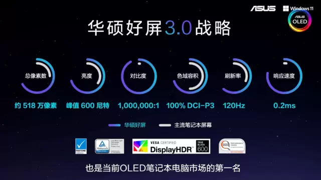 自去年提出“华硕好屏”概念以来,华硕凭借首次对笔记本电脑“好屏”的清晰定义,让用户重新认识了高素质屏幕并非奢求。今年,华硕好屏3.0战略更是以科技实力,将轻薄笔记本屏幕素质提升到新的极致。此次发布的诸多新品不仅拥有120Hz超高屏幕刷新率,更有令LCD望其项背的0.2ms响应速度、100%DCI-P3广色域、550以上尼特亮度、1000000:1超高对比度等起跑标准,内置的华硕OLEDCare防烧屏技术,支持四种色域模式切换,帮助用户轻松享受华硕好屏带来的,、以往只有高端显示器才可拥有的极致逼真色彩和细腻丝滑的惊艳感受。全系OLED还支持全亮度DC调光和硬件级防蓝光技术,不仅好看,且更加耐看。