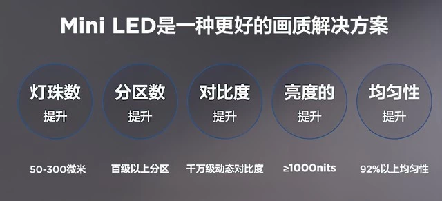 Mini LED是一种直径在100-300微米的微型LED灯珠芯片,是普通LED灯珠的百分之一大小,因为灯珠非常小,所以相同尺寸的电视在背光上就可以布局更多灯珠,也才可以实现更多的、更小面积的背光分区,那背光分区越多,单位控制的分区面积越小、也就可以实现更高对比度和更好的HDR效果;同时也是因为灯珠数量更多而且更小的原因,所以在每一个背光分区中,相同的面积可以容纳更多的Mini LED灯珠,这样就可以让每一个分区实现更好的光均匀性,也就能实现更加逼真更加优质的画面。