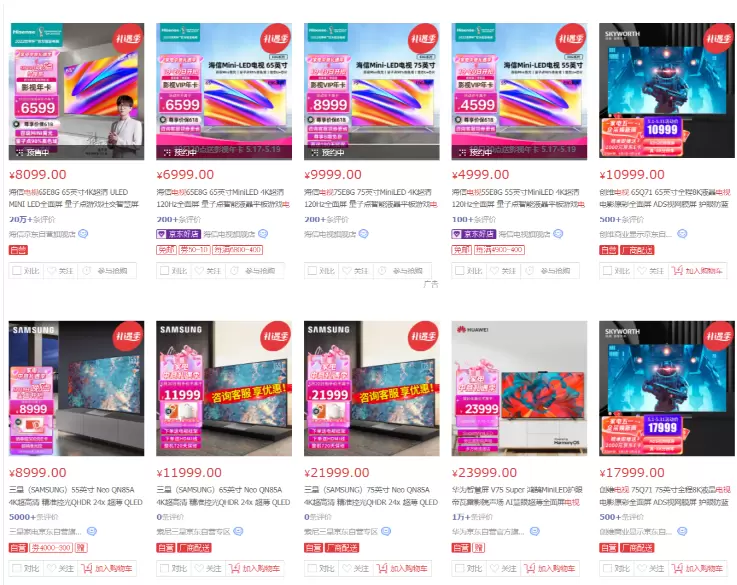 4499买Mini LED电视?这搁以前是想都不敢想的事情,要知道Mini LED电视在以前可是很难有6000元以下的起售价,但是TCL做到了。不信,我们随便打开打开一个电商品牌来看看: