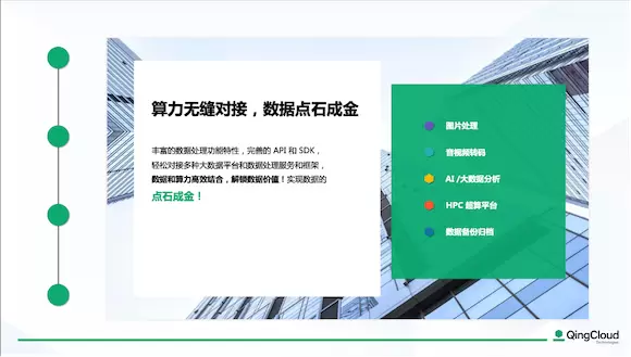 QingStor U10000还拥有一整套完善的对接机制,提供一系列完善的API、SDK,可以轻松地对接大数据平台、数据处理的框架和服务,实现数据和算力的高效结合,涵盖常见的图片处理、音视频转码、AI大数据分析、HPC超算平台、数据备份存档等应用。