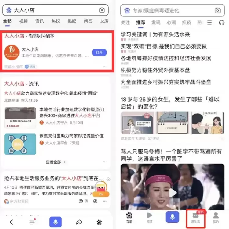 用户或者商家只需在百度APP上搜索“大人小店”就可进入大人小店平台,或者从百度APP底栏进入“惠生活”,点击顶部搜索“大人小店”进入。