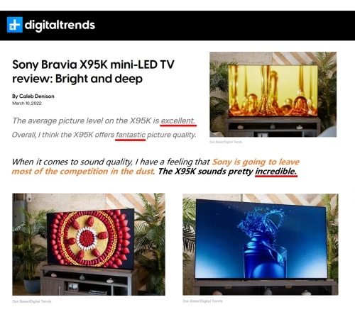 知名海外权威数码媒体《Digital Trends》在评测文章(https://www.digitaltrends.com/home-theater/sony-bravia-x95k-mini-led-tv-review/)中对X95K体验后表达了充分的认可,他认为X95K的图像水平非常出色:“它具有非常丰富鲜艳的色彩、生动的HDR、出色的高光和阴影细节,以及优质的声音表现”,并表示“它(X95K)音画表现所带来的冲击力远远超过我测试过的大多数液晶电视”。在音质表现上更是不吝啬地评价道“索尼将一骑绝尘,领先众多竞争者”。