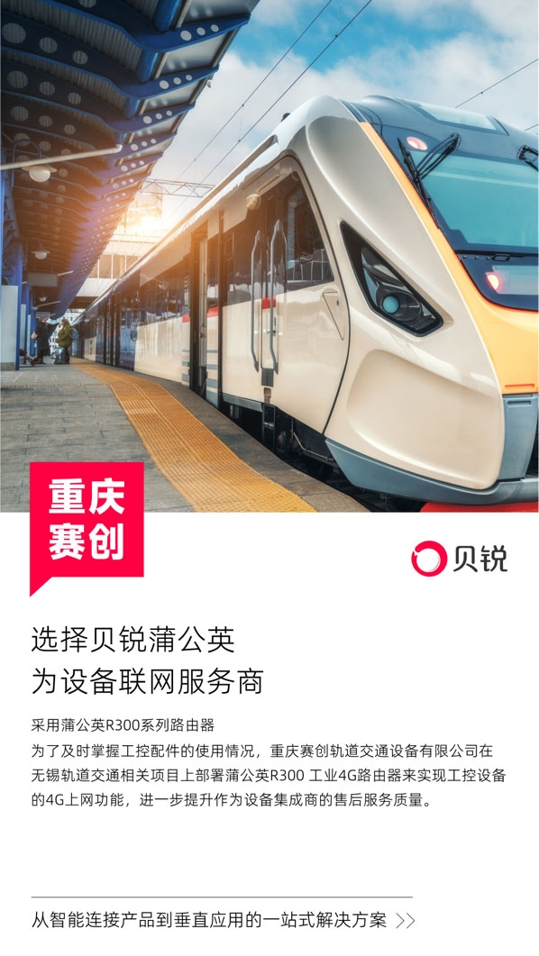 贝锐旗下智能组网品牌蒲公英与重庆赛创轨道交通设备有限公司(以下简称重庆赛创)展开合作,为了及时掌握工控设备的使用情况,重庆赛创在无锡轨道交通相关项目上,通过部署蒲公英R300 工业4G路由器的方式来实现工控设备的4G上网功能,希望进一步提升其作为设备集成商的售后服务质量。