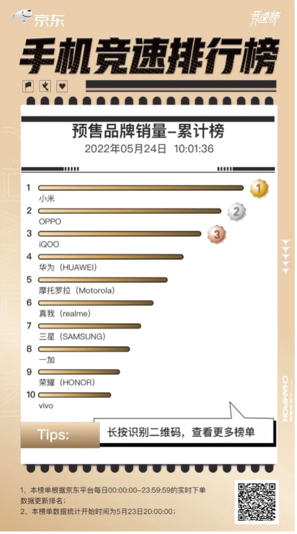 凭借着多款产品的不俗表现,小米也如愿拿下了京东手机预售品牌销量累计榜冠军,OPPO则拿下第二,iQOO则凭借iQOO 9的优异表现拿下第三。TOP10其余位置则被华为、摩托罗拉、realme、三星、一加、荣耀、vivo承包。