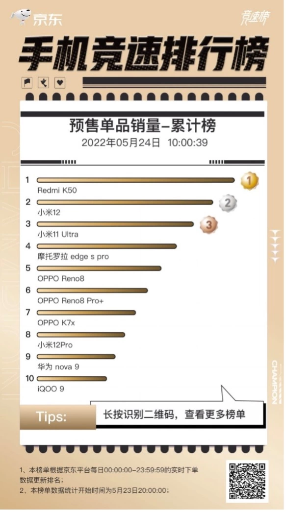 截至5月24日10点,经过几个小时的奋战,京东手机预售单品销量累计榜TOP3被小米包揽。Redmi K50凭借天玑8100处理器+2K旗舰直屏+67W快充的极致性能组合,斩获榜首。小米12虽然是年初发布的,但性能和外观也受到用户青睐,获得亚军,影像物种小米11 Ultra则拿下了季军。刚发布的OPPO Reno8系列也表现不俗,OPPO Reno8、OPPO Reno8 Pro+分列第五、第六位。摩托罗拉 edge s pro、OPPO K7x、小米12 Pro、华为nova 9、iQOO 9也均榜上有名。
