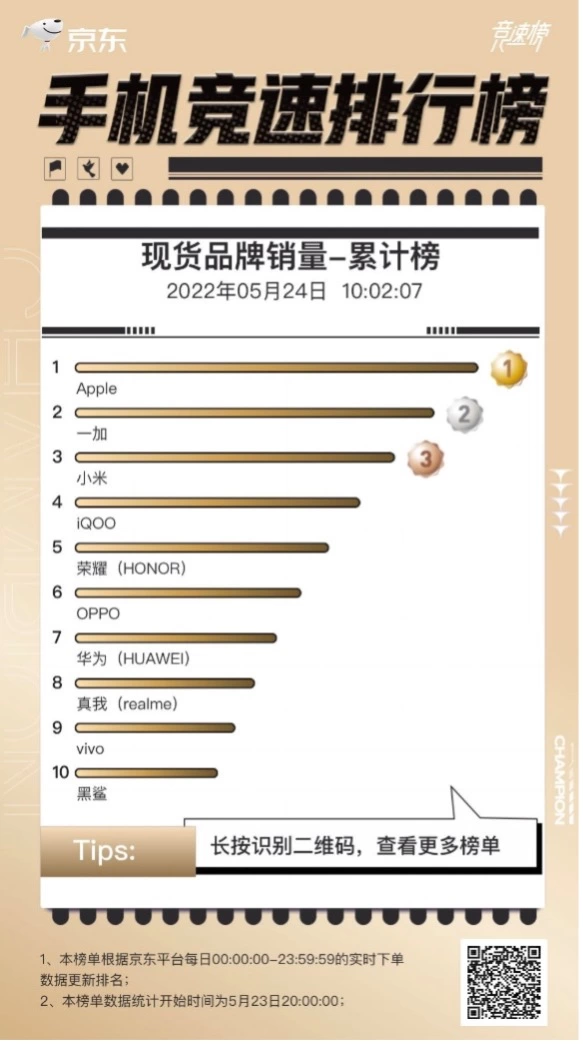近几年,一加凭借极致性价比的产品赢得了许多消费者的青睐,一加10 Pro凭借全新一代骁龙8移动平台+LPDDR5+UFS 3.1性能铁三角,以及立体空间散热系统,被众多网友称为“机皇”,拿下了京东手机现货单品销量累计榜冠军。iQOO Neo5 SE、iQOO Z5、OPPO K9 Pro、iPhone 13则拿下第二到第五位置。在现货品牌销量累计榜中,Apple获第一,一加凭借一加10 Pro、一加9RT的优异表现拿下了亚军,小米获得季军。iQ00、荣耀、OPPO、华为、realme、vivo、黑鲨则包揽了TOP10其余位置。