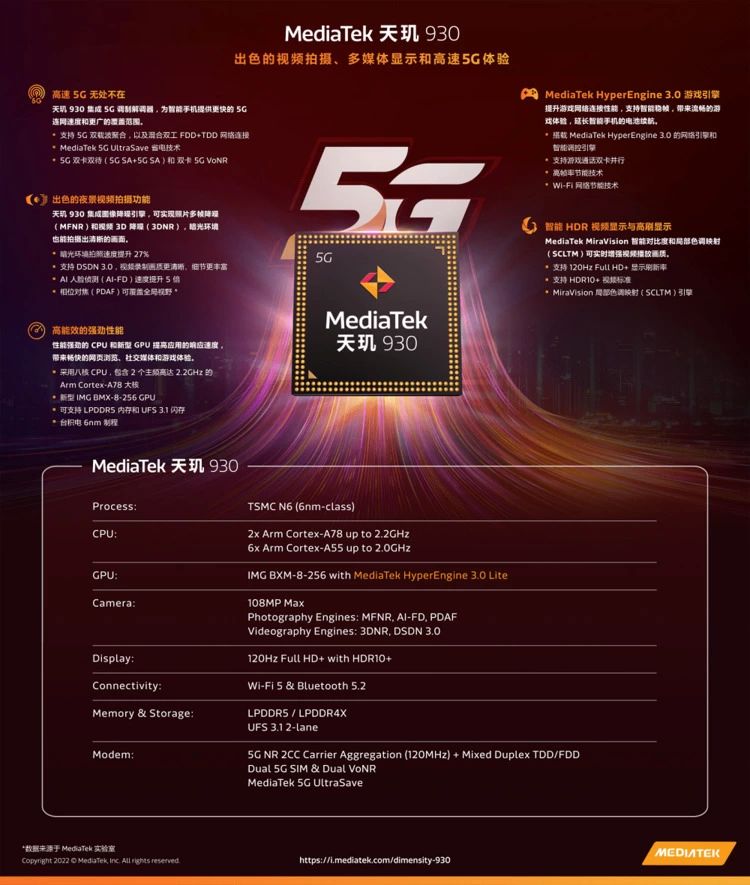 天玑 930 5G手机芯片速率快、覆盖广,带来优质5G网络体验(图源联发科)