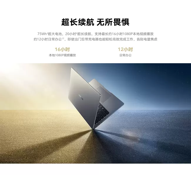 功耗降低,性能却依旧保持满血释放。全新荣耀MagicBook 14全系配备12代智能英特尔酷睿标压处理器,最高搭载NVIDIA RTX 2050独显。在OS Turbo技术加持,和全新散热设计赋能下,实现了70W满血性能火力全开。相较同类产品,可实现软件响应速度最快提升31.4%,再结合OS Turbo技术叠加75Wh超大容量电池,使得全新荣耀MagicBook 14整机亮屏待机最长20.5小时,带来轻薄本续航和性能可以兼顾的超值体验。