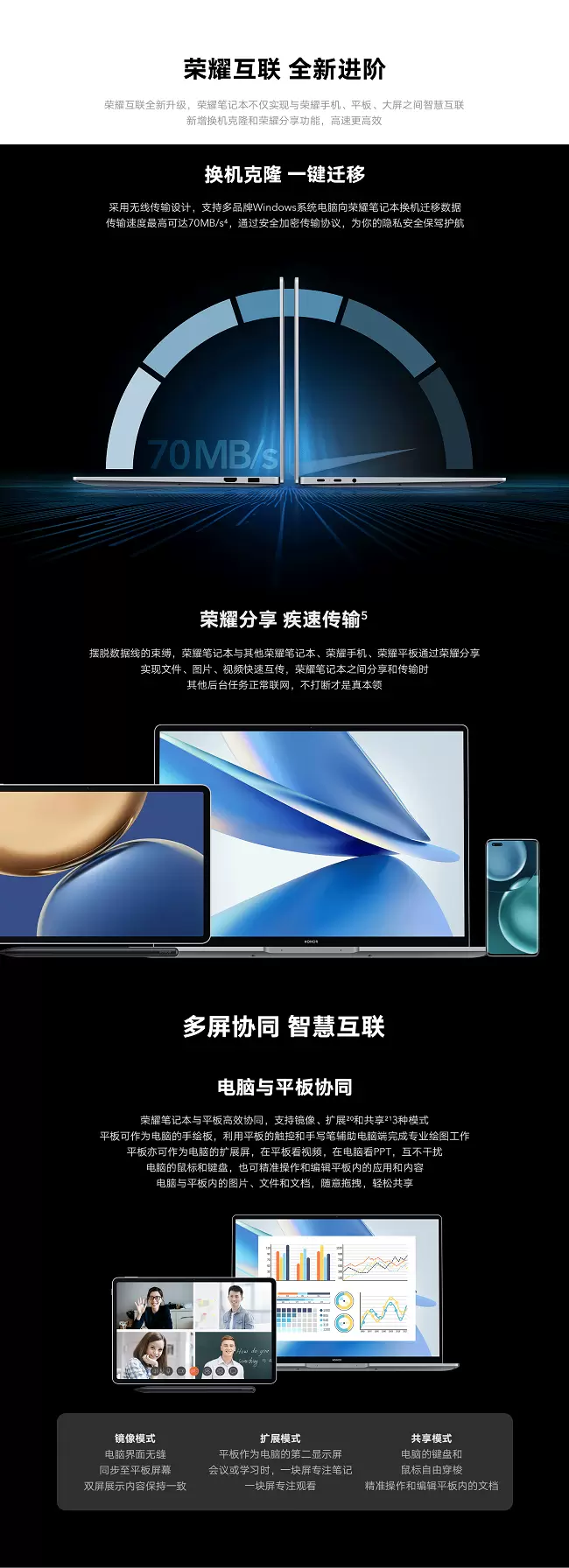 此外,全新荣耀MagicBook 14互联能力再次升级。在全场景智慧生态协同下,可实现PC与其他智能终端之间免流量快速传输;荣耀分享中,荣耀MagicBook 14和Magic4传输速率达70MB/s,相较苹果笔记本电脑和手机之间互传的37.91 MB/s速率快近一倍;而换机克隆最高传输速率达70MB/s,换机时数据迁移更迅速。通过能力全面升级,全新MagicBook 14为消费者带来个性化、智慧化的全场景体验和服务。
