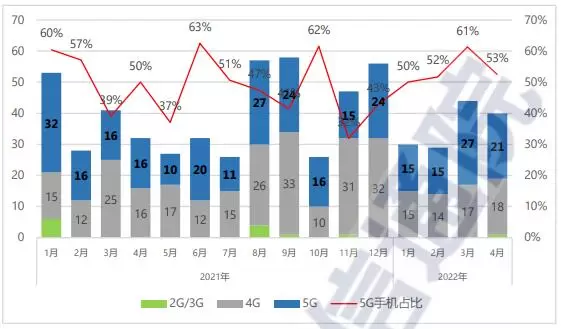 2022年1-4月,国内市场手机总体出货量累计8742.5万部,同比下降30.3%。其中,5G手机出货量6846.9万部,同比下降25.0%,占同期手机出货量的78.3%。