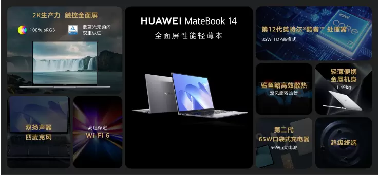 华为MateBook 14依旧延续了全面屏性能轻薄本的定位,款搭载全新第12代英特尔®酷睿™处理器,带来超级终端、智慧搜索、智慧语音、华为分享、指纹电源键、超级快充等便捷功能,办公常遇到的场景,诸如移动办公、文件跨端搜索、会议纪要、跨国会议需要即时翻译都能完美覆盖。全系标配2K触控全面屏,实现“四面微边框”设计,屏占比高达90%,拥有100%sRGB广色域,让用户视野更宽阔,视觉更逼真,体验更沉浸!整机轻至1.49kg,最厚处仅15.9mm,绝对是重度办公需求人群的首选。