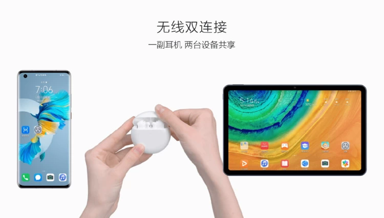 华为耳机与两台设备连接后,给用户带来快人一步的跨设备音频场景。比如,当你戴上耳机,在平板或PC上聆听音乐或观影,手机来电时,耳机会自动切换到手机的通话声音,平板的音乐或视频会暂停或外放。影音来电两不误,打造更贴心的双设备音频体验。