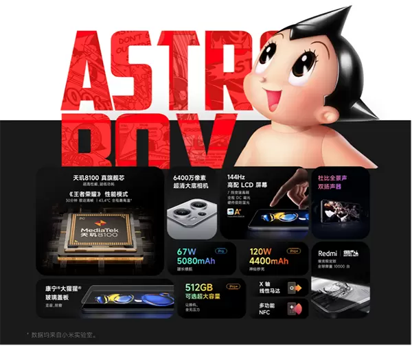 值得一提的是,Redmi联合「铁臂阿童木」推出了Redmi Note 11T Pro+潮流限定版,机身经过铂金浮雕工艺,形成周期、高度、角度、形状各不相同的微观纹理,将阿童木半透视机械结构100%复刻至机身,实现裸眼3D般的立体效果,号称“打造收藏级的精致外观”。