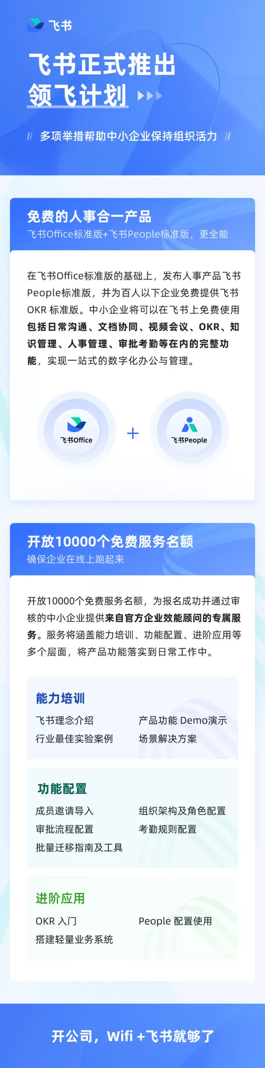 5月25日,飞书举行春季未来无限大会,飞书首席商业官林婵宣布推出“领飞计划”。该计划包含了一揽子中小企业扶持方案,飞书将为中小企业免费提供“人事合一”的飞书Office标准版与飞书People标准版。同时,飞书还将为中小企业提供一万个免费企业效能顾问服务名额,帮助企业落地更好的数字化办公方案,从产品和服务两个维度全面助力中小企业应对挑战。