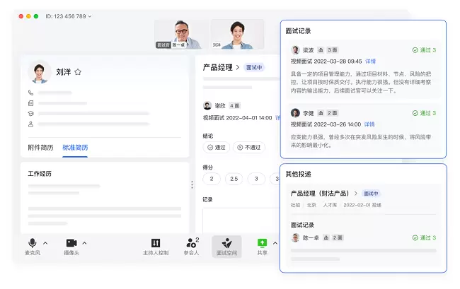 此外,飞书招聘还与飞书Office有着良好的适配与打通,通过日历即可预订面试官时间,点击飞书招聘推送即可进入视频面试,面试官也可以边面试边评价,并随时一键拉取候选人跟进群,追踪候选人面试进度,不用在多个系统中来回跳转。