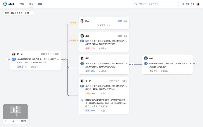在飞书OKR 中,管理者能清晰地看到战略如何层层落地,最核心的目标由哪些员工来承接,以及哪些人在拆解目标中驱动着创新。