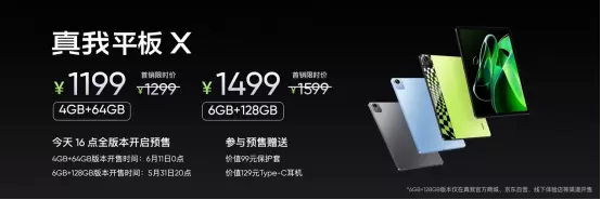 真我平板X及其配件的售价在本次618盛典上同步揭晓,其中真我磁吸触控笔售价为499元;真我智能键盘售价为399元;真我平板X的4GB+64GB版本售价1299元,首销限时价1199元;6GB+128GB版本售价1599元,首销限时价1499元,5月26日16点开启预售,参与预售即可获赠99元保护套和129元Type-C有线耳机。5月31日20点,真我平板X的6GB+128GB版本将在真我官方商城、京东等渠道正式开售;6月11日0点,4GB+64GB版本将在全渠道开售。