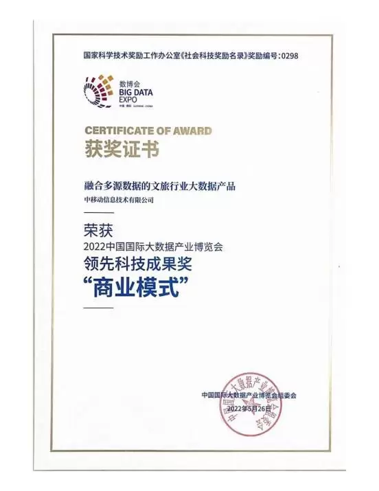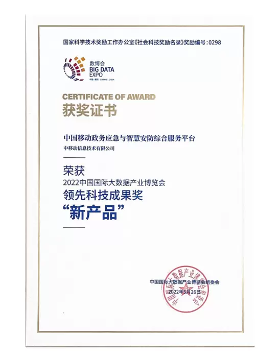 5月26日, 2022中国国际大数据产业博览会(以下简称“数博会”)领先科技成果发布活动在线上举办,并发布了领先科技成果奖55项。凭借领先技术优势及优秀应用成果,中国移动梧桐大数据在大会上斩获多个奖项:“中国移动政务应急与智慧安防综合服务平台”和“融合多源数据的文旅行业大数据平台”2个项目获得“领先科技成果奖”,“中国移动位置大数据行业级原子能力体系”获得“优秀项目奖”。