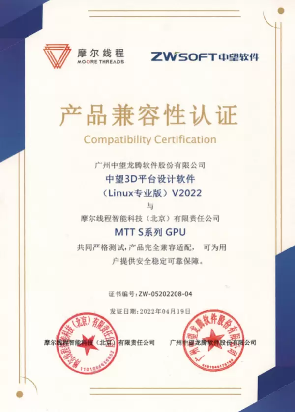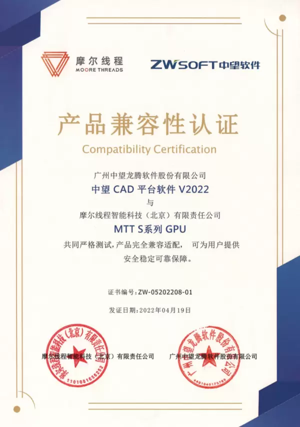 图:中望CAD 2022与MTT S系列GPU兼容性认证证书