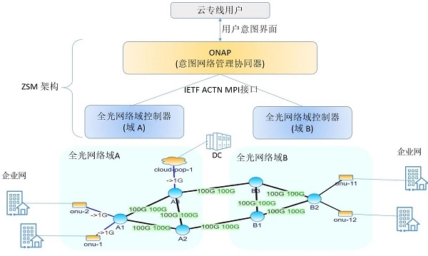 本次测试在端到端的总体架构上采用了ETSI ZSM 002标准业务管理架构,传送网分层控制的架构采用了IETF RFC8453 ACTN标准并实现了相关的接口数据YANG模型。该架构中包含基于ONAP的意图网络管理协同器(简称协同器)和全光网络域控制器(简称域控制器)。协同器负责端到端用户和业务意图生命周期管理和交互闭环、网络意图保障闭环、跨域云专线业务编排和协同等功能。域控制器负责云专线业务发放和管理、网络管理和网络性能变化通告等功能。协同器和域控制器之间采用标准ACTN接口数据YANG模型。本次测试内容包括将用户意图自动转换成ACTN业务模型,并在网络侧同步实现云专线业务的发放、修改和删除,业务SLA保障等测试用例。