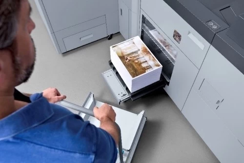 相比以往同类机型,AccurioPress C7100系列提供了更多选择和灵活配置,不但拥有和AccurioPress C14000系列同样的大容量纸柜,也拥有和AccurioPress C4080系列同类型的大容量纸仓,用户可根据自身需求自由选择。其中,大容量长纸纸柜可容纳900mm的纸张共2,300张(128g/m2),还可选配手送以打印1,300mm的纸张,手送安装于纸柜顶部,可有效节约空间;大容量纸仓也可选购,其可达到762mm的大量进纸,同时还可搭配手送以打印1,300mm的纸张,可进一步拓展印刷生产力。