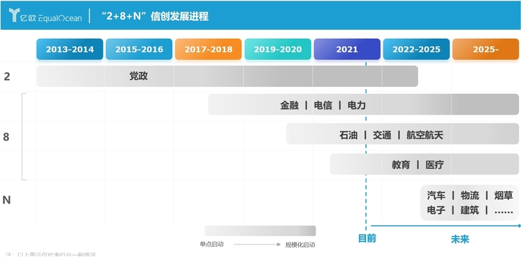 从全国范围内看,2020年起,我国信创进入大规模落地推广阶段。随着国家提出“2+8+N”信创体系,包括党、政+金融、电信、电力、石油、交通、教育、医疗、航空航天八大关键行业+信创产品全面应用。根据海比研究院《2021年中国信创生态报告》,信创产业预计五年复合增长率可达37.4%。