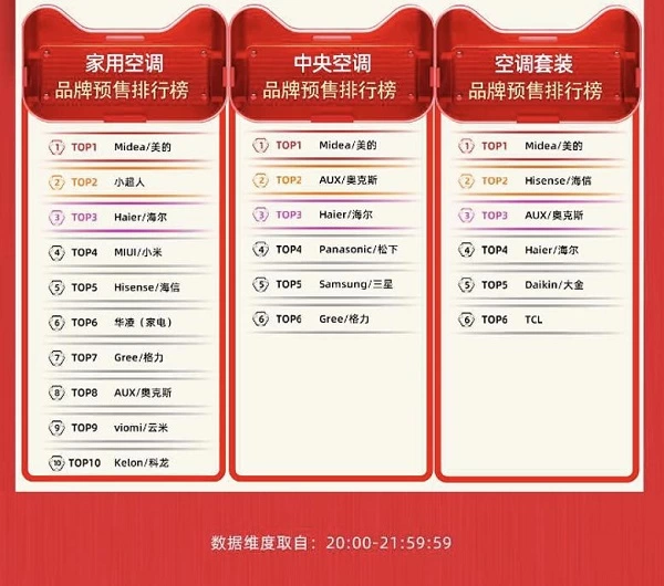 根据天猫空调行业618品牌预售排行榜数据显示,美的、小超人、海尔荣登前三甲。细分至中央空调品牌预售排行榜,美的、奥克斯、海尔则排名前三。综合来看,国民品牌美的在“家用空调、中央空调、空调套装”三大细分榜单中均实力领先,凭借着更为出色的产品质量和口碑领跑天猫中央空调预售榜。