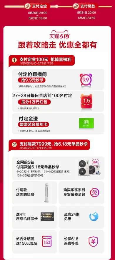 不仅如此,618年中大促期间,美的中央空调为回馈广大消费者的信赖特别推出了多重预售+尾款权益。现在在天猫美的中央空调官方旗舰店下单预定,即可享受:①31日20点前1小时抢8099,全网前5名付尾款抢6.18元秒杀,6-20名抢1618元秒杀;②付定顾客参与直播间抽9.9元秒杀(30日20点直播抽奖);③预定送精美赠品(塔扇/电饭煲+爱奇艺年卡+4年延保卡);④安装全包;⑤24期花呗分期免息等福利。目前,天猫美的中央空调官方旗舰店的618活动页面已上线,想要省钱、好物两手抓的朋友可以自行前往浏览并预定。