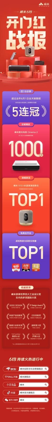 捷报频出 峰米投影用时19分钟创造618活动首日销售额新纪录