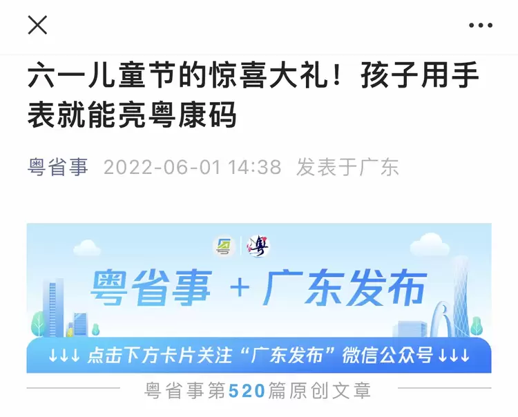 考虑到家长和孩子的需求,广东小天才科技有限公司联合广东省数字政府建设运营中心(数字广东网络建设有限公司)联合上线了“粤康码”应用。孩子通过小天才电话手表上的粤康码,可以做到一键亮码,快速出示个人的健康码、核酸检测、新冠疫苗接种信息,告别纸质卡、保管难等难题,实现电话手表也能“一码走广东”。