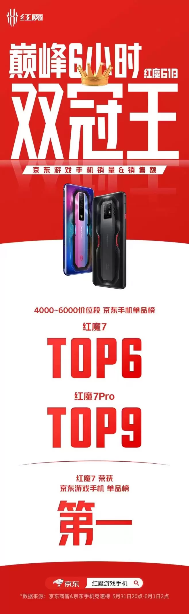 - 开售6小时斩获京东双冠王,红魔7系列成功霸榜618京东游戏手机前三