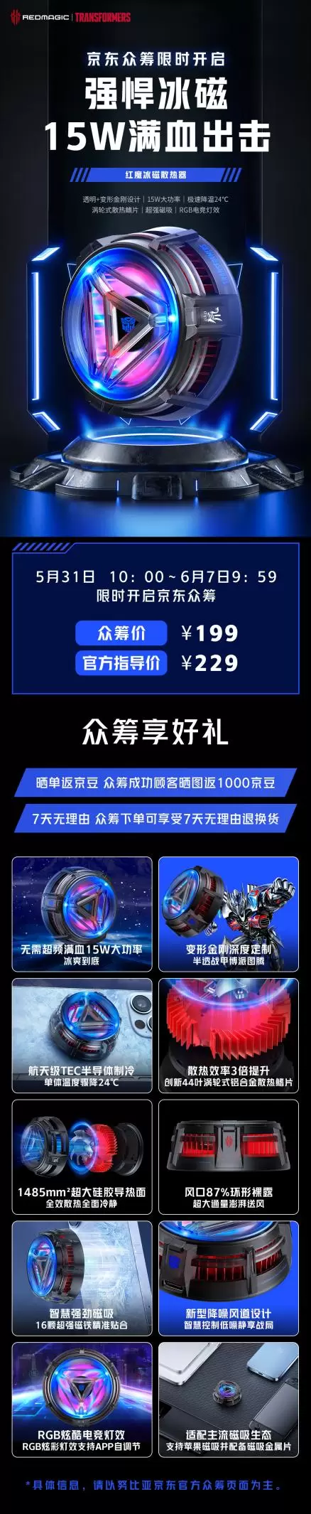配件方面,市场热销的氮化镓充电器、红魔手表、红魔耳机等常规配件我们暂且不谈,单就红魔×变形金刚联名版冰磁散热器来看,就已经非常吸引人,目前正在众筹,即日起到6月7日9:59,该产品的活动到手价仅199元,而且众筹成功的用户晒单享更多权益,想要入手散热器的朋友值得抢购。