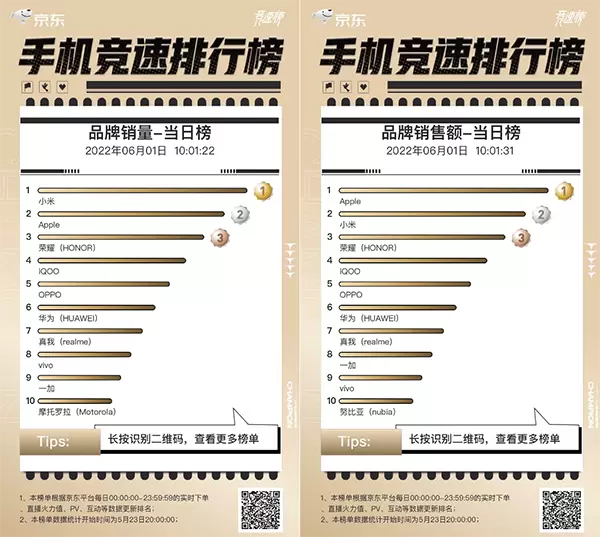 在手机品牌销量榜方面,小米凭借多款产品的亮眼表现,拿下当日榜榜首,Apple也不甘示弱拿下当日榜亚军,荣耀则拿下了季军,iQOO、OPPO紧随其后。累计榜则有些许变化,Apple凭借高客单价荣获榜一,小米拿下榜二,荣耀位列第三。在京东手机排行榜手机品牌销售额榜中,Apple、小米、荣耀分列当日及累计榜冠军、亚军、季军。