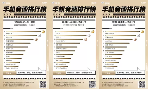 截至6月1日10点,京东手机排行榜手机单品当日榜中,Redmi 9A拿下冠军,iPhone 13、荣耀畅玩20紧随其后,而在累计榜中,iPhone 13则凭借前几日的高能福利拿下冠军,Redmi 9A、荣耀畅玩20位列亚军、季军。在京东手机排行榜手机单品榜3000-4000价位段中,小米12斩获当日榜及累计榜榜首,iPhone 11斩获了累计榜冠军。折叠屏手机榜中,OPPO Find N、荣耀Magic V、vivo X Fold荣获当日TOP3。